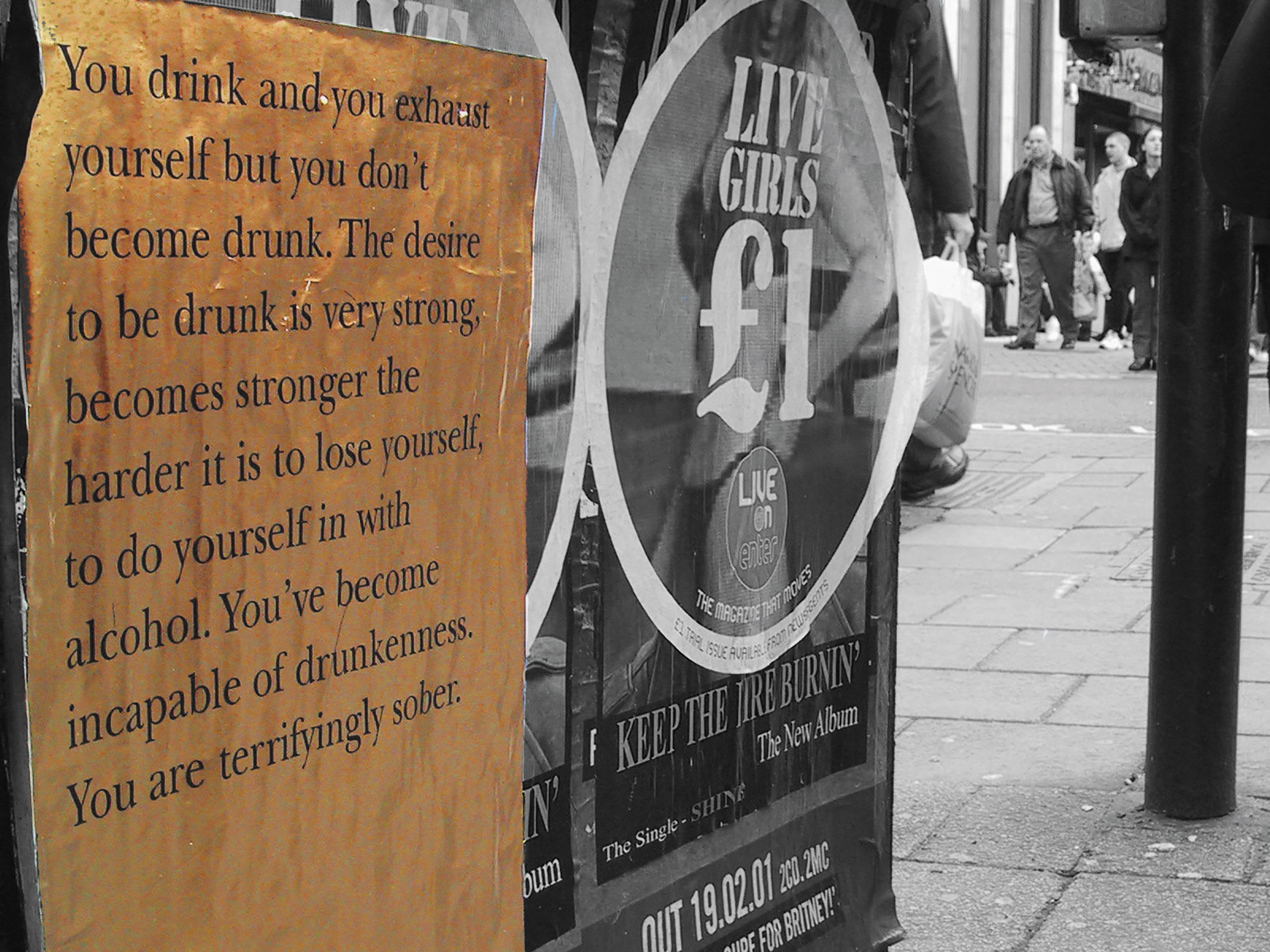 Untitled (Fly-posters). You drink and you exhaust yourself but you don't become drunk. The desire to be drunk is very strong, becomes stronger the harder it is to lose yourself, to do yourself in with alcohol. You've become incapable of drunkenness. You are terrfiyingly sober.