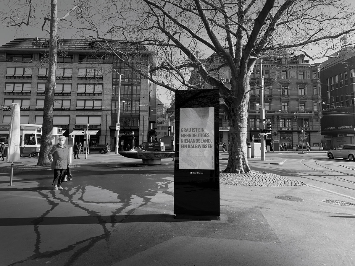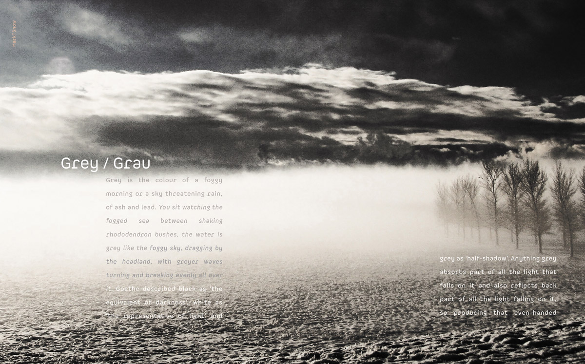 Für mich ist das Grau immer schwer zu fassen. Grau ist ein nebliges Rätsel zwischen der einfühlsamen Gewissheit von Schwarz und Weiss. Es ist ein Niemandsland, das von keinem bewohnt ist. Grau ist, sich einer Sache halbbewusst zu sein, eher eine Unsinnigkeit, ein Bewusstsein so vage wie grau.