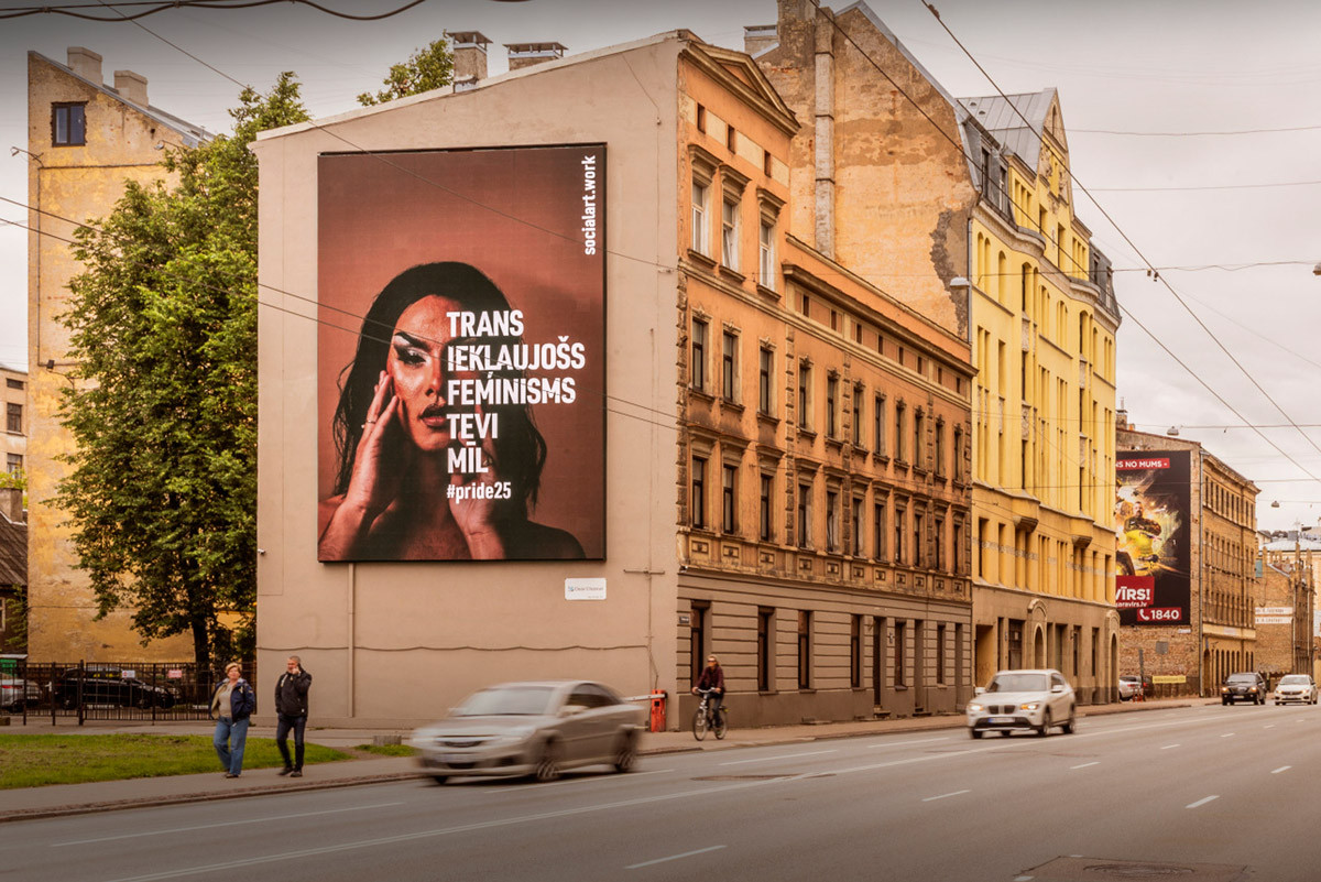 The artwork appears in Latvian, one of the two oldest European languages. This is required by law but is also the artist's preferred strategy because it roots the work in the local language.