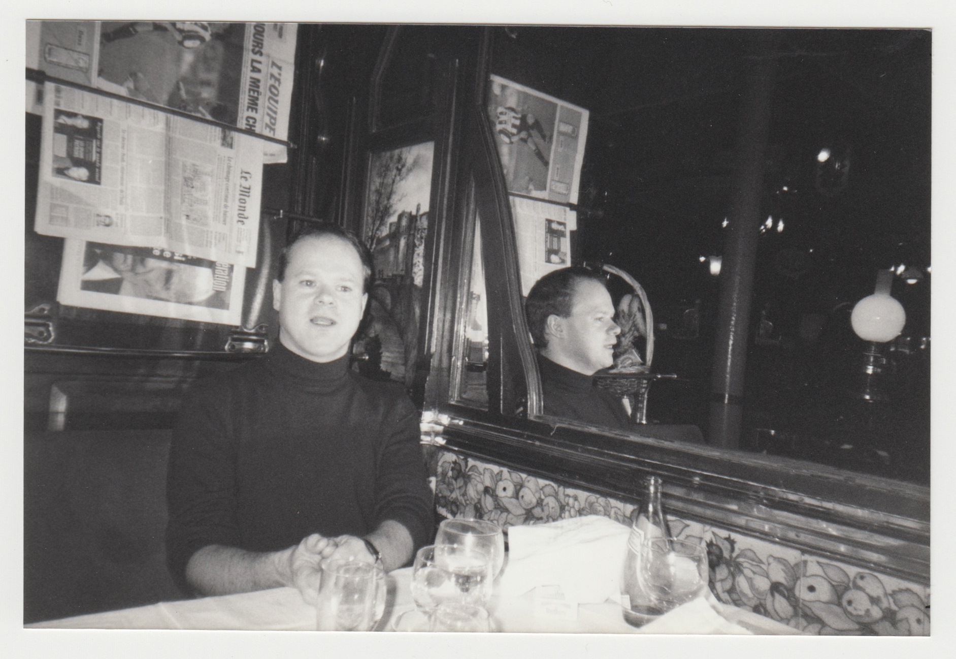 Martin Firrell at Brasserie Vagenende, 142 boulevard Saint-Germain 75006 Paris France, 1998. Photographer unknown, precise date unknown.