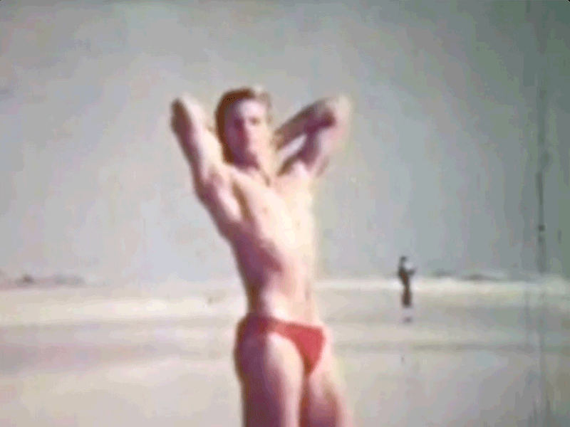 is a 6 frame gif derived from 16mm footage shot on Fire Island in the 1970s. The degraded image makes it impossible to identify the artist with any certainty (and the artist himself will not be drawn on the subject). The most that can be said, then, is that the image is a cypher for self-representation, almost certainly an ironic reference to the rise of the selfie, and a comment on the acute body consciousness customarily found in the gay community.