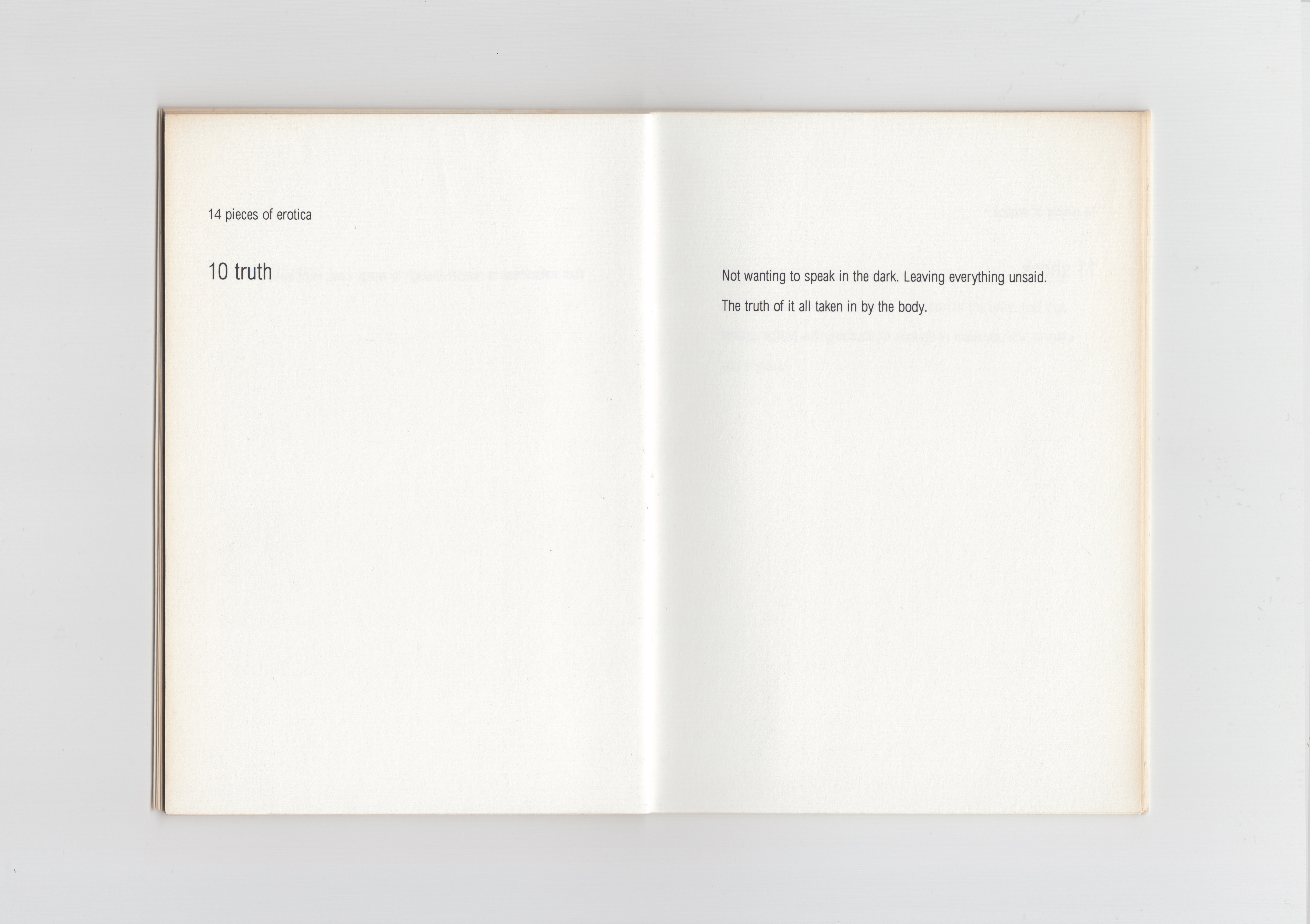 was created with Soho sex shop Coco de Mer. In addition, the work consisted of 14 Flash animations displayed on the digital billboard operated by Clear Channel UK at 1 Leicester Square, London UK. The artist gave readings at the Coco de Mer store on Valentine's Day, 2002. 14 copies of the booklet were hand annotated by the artist with 'extra filthy bits' and these were gifted by the artist to Coco de Mer customers at the artist's whim.