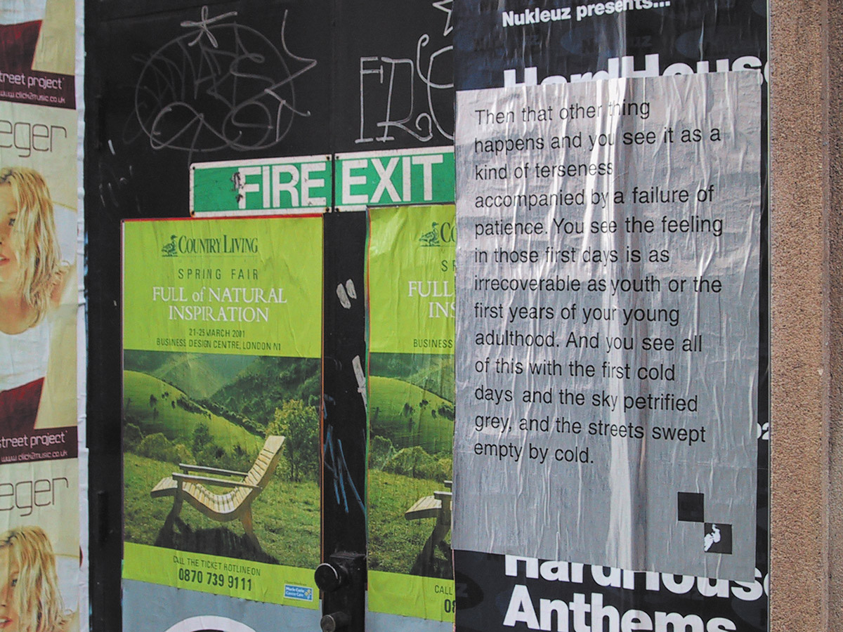 At the beginning of the century, Firrell experimented with fly-posting poetic descriptions of love and loss in London's Soho. These are the first artworks created by the artist in the poster format, the first to occupy space more usually associated with commercial messaging, and the first works intended as public art.