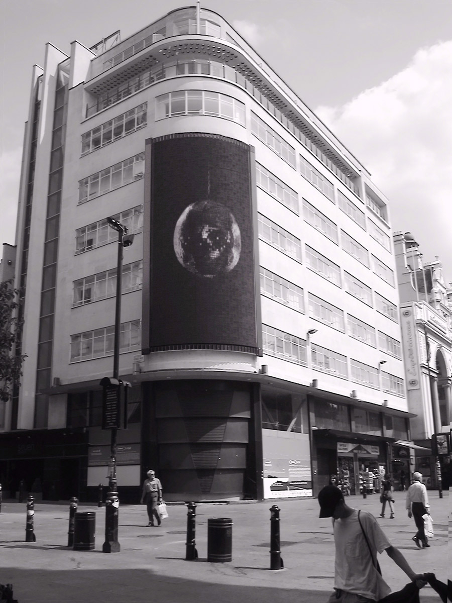 The screen was an early, experimental digital system installed on the outside of Home nightclub at 1 Leicester Square, London WC2H 7NA, 1998-99 with an audience of c.250,000 people a day.