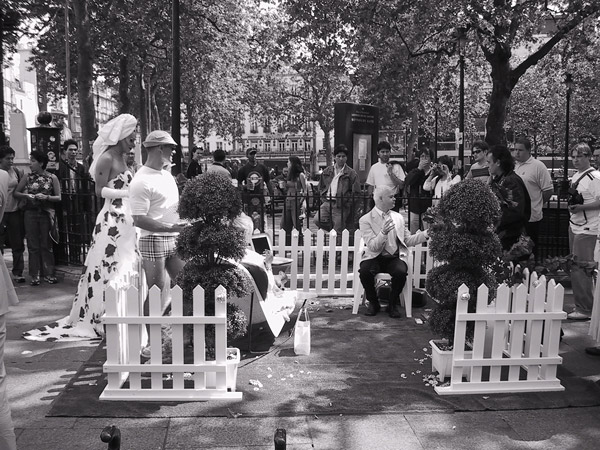 included a performance in Leicester Square featuring an artificial picket-fenced garden, a drag queen, a 'muscle mary', and the artist (to the right of the photograph).