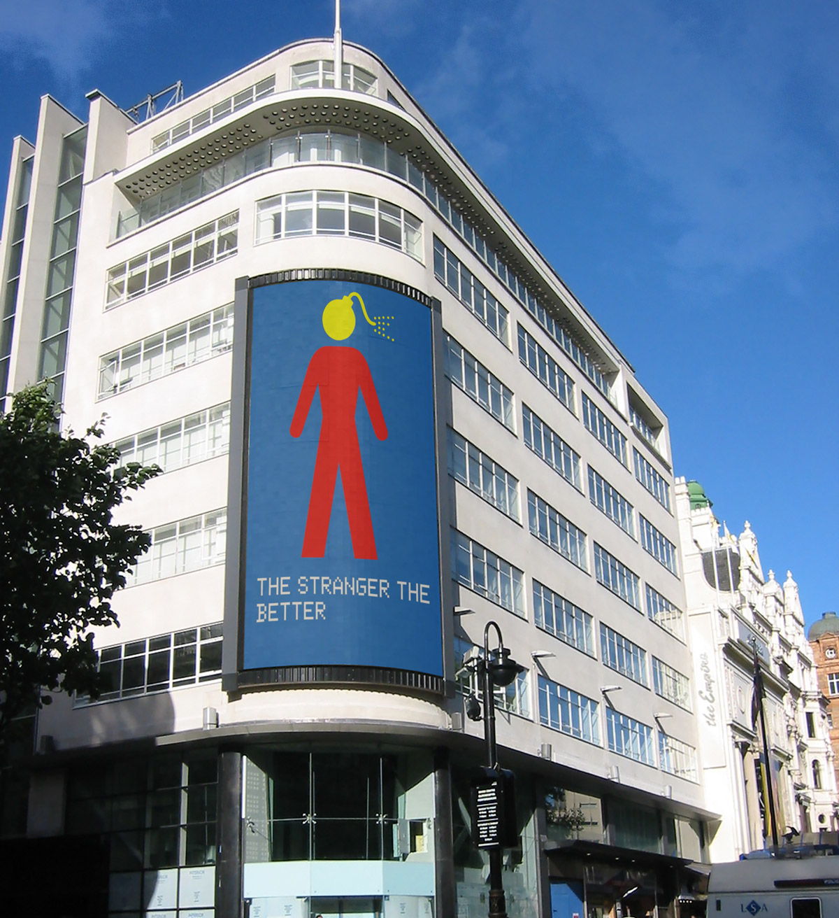The artwork implies the need to embrace risk if life is to be fully experienced. In the accompanying pictogram, the stranger’s head is shown as a bomb with a burning fuse.