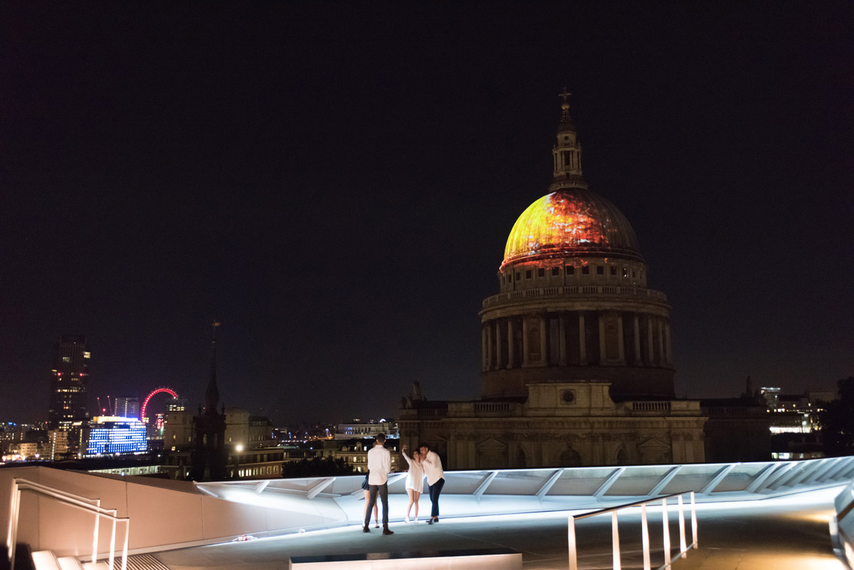 presented fire on the dome of St Paul's in waves of colour consistent with flame of increasing temperatures (from dull orange to yellow to blue to brilliant white).