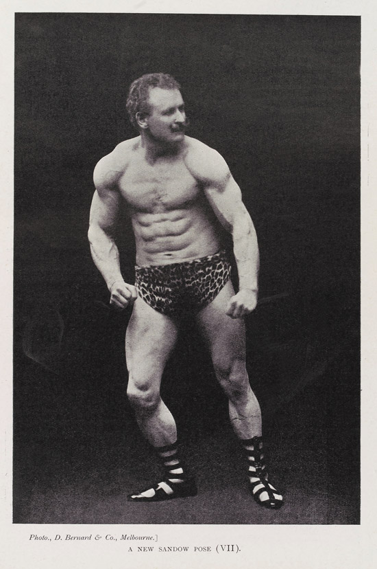 Eugene Sandow (Friedrich Wilhelm Müller 1867 - 1925) was a German bodybuilder and showman and, arguably, the first man to bring a methodical approach to developing the male physique. He measured the proportions of classical male statues in museum collections so that he could develop his own physique to echo the proportions of the Greek ideal. He became hugely influential, the forerunner of the modern physical fitness industry.