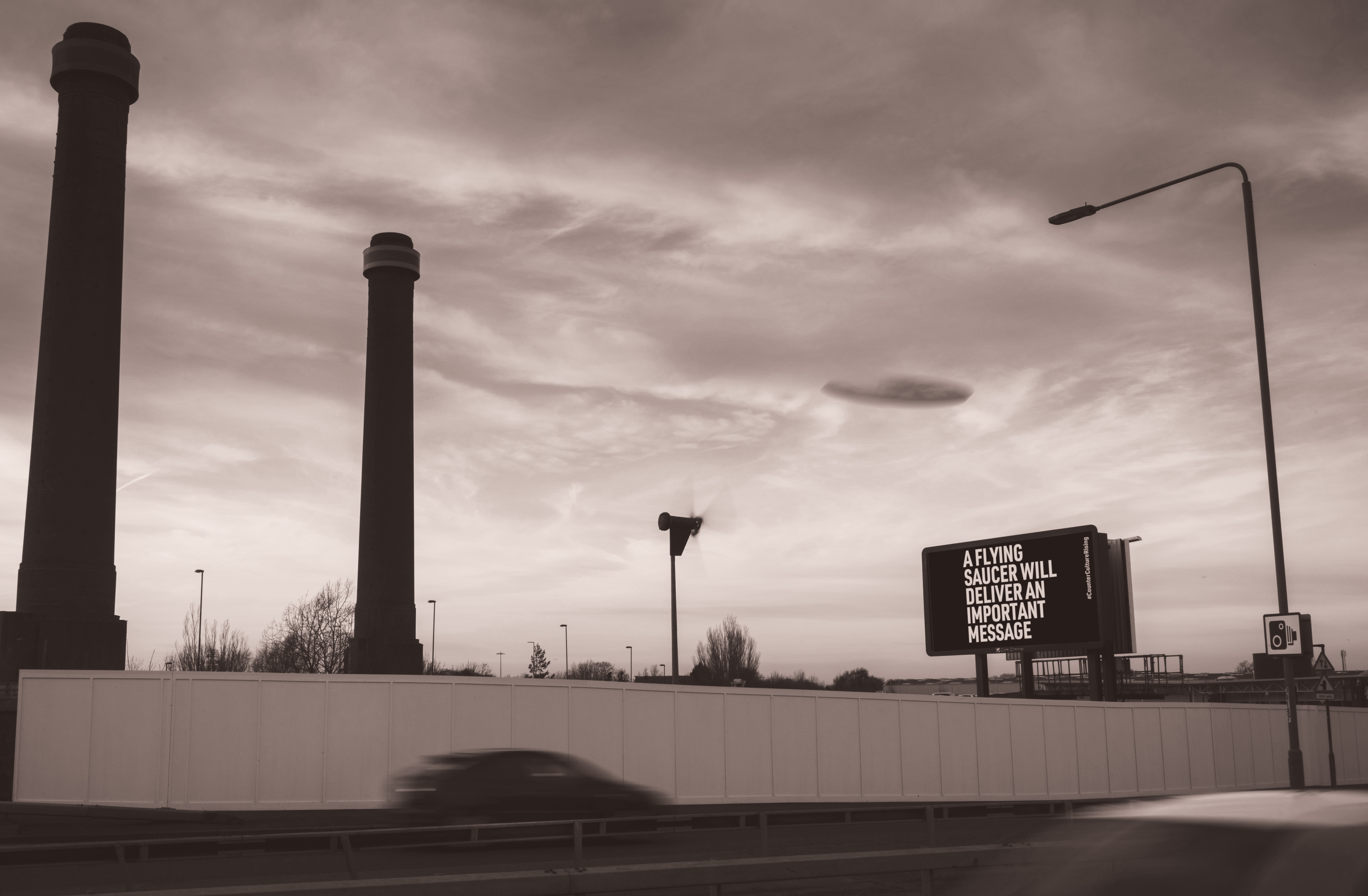 Documentary photograph by Yves Salmon, Croydon UK, January 2020, embellished by the artist. The hippy counter culture was often associated with UFO phenomena: hippies living psychedelically tended to see all kinds of things in the sky. The idea was prevalent in the 1950s and 60s that aliens would visit earth with dire warnings about man's reckless atomic testing or degradation of the environment. Alien wisdom would ultimately lead to a raising of human consciousness that would save the planet. Or the aliens would simply destroy humanity to protect the earth.