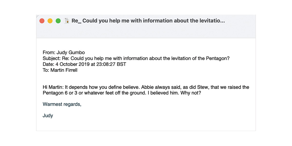'When I asked Judy if the Pentagon had actually levitated, she told me Abbie Hoffman and her activist husband Stew Albert said the Pentagon rose between 6 or 3 feet off the ground. ‘I believed them,’ she wrote to me. ‘Why not?’