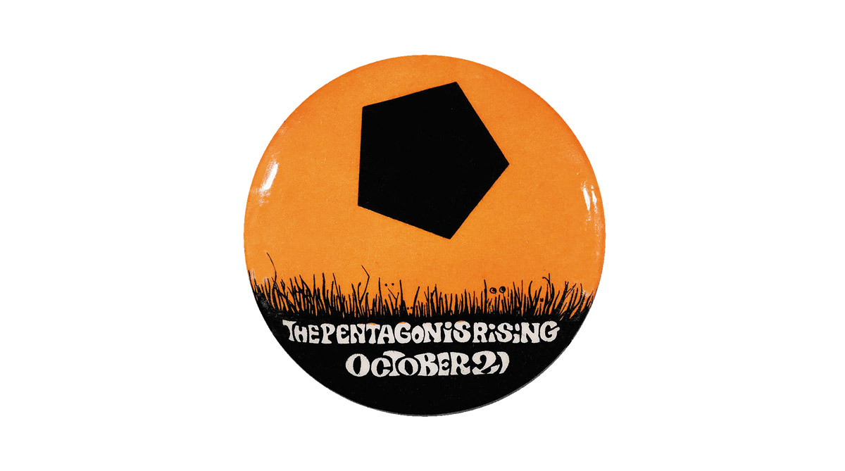 His research was inspired initially by a small button badge from the Labadie Collection, University of Michigan, publicising the levitation of the Pentagon planned for 21 october '67.