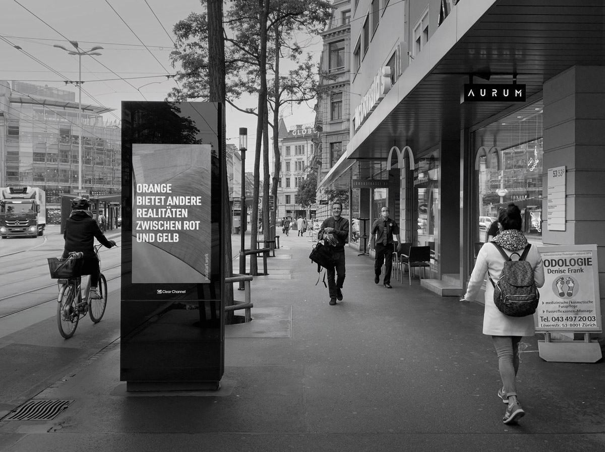 Stellen Sie sich ein immer dunkler werdendes Orange vor, bis Sie Rot haben, stellen Sie sich ein immer heller werdendes Orange vor, bis Sie Gelb haben - das ist möglich, auch wenn Sie noch nie zuvor Rot oder Gelb gesehen haben. Der französische Philosoph Henri Bergson beschrieb Orange als den Eindruck, ‘zwischen Rot und Gelb gefangen zu sein’. Orange ermöglicht es, intuitiv Realitäten zu erfassen, die sich hinter unseren Sehgewohnheiten verbergen.