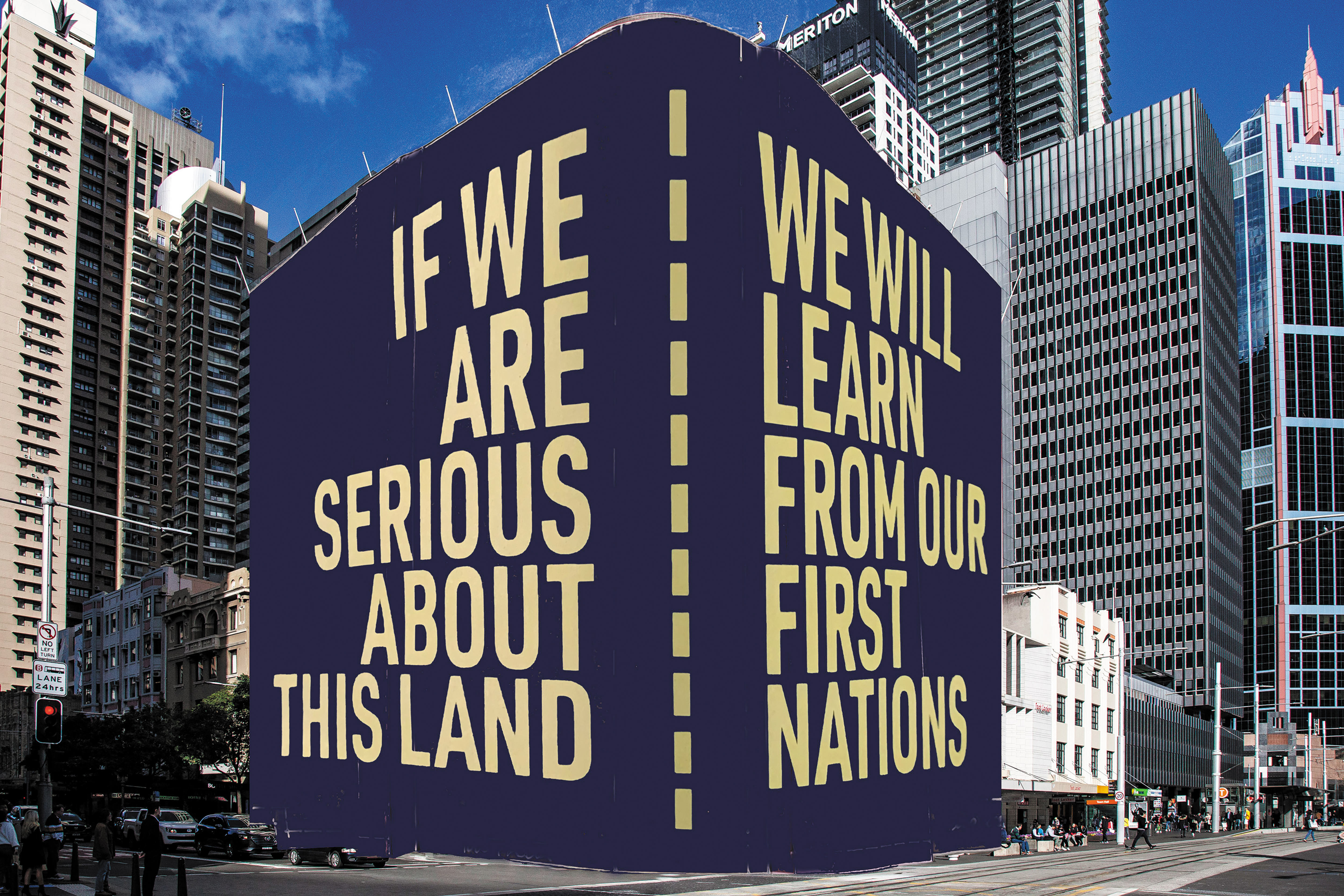 2021, scaffold wrap, 780.4 x 384.7m, created in conversation with Nathan Moran, CEO of the Metropolitan Local Aboriginal Land Council (MLALC), for the