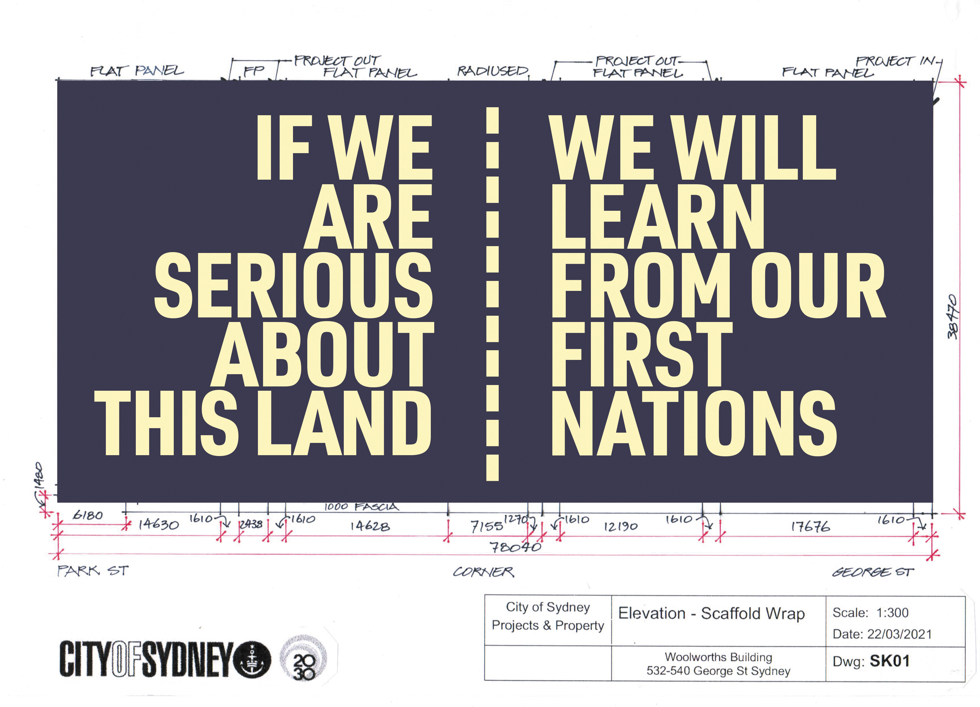 2021, scaffold wrap, 780.4 x 384.7m, created in conversation with Nathan Moran, CEO of the Metropolitan Local Aboriginal Land Council (MLALC), for the