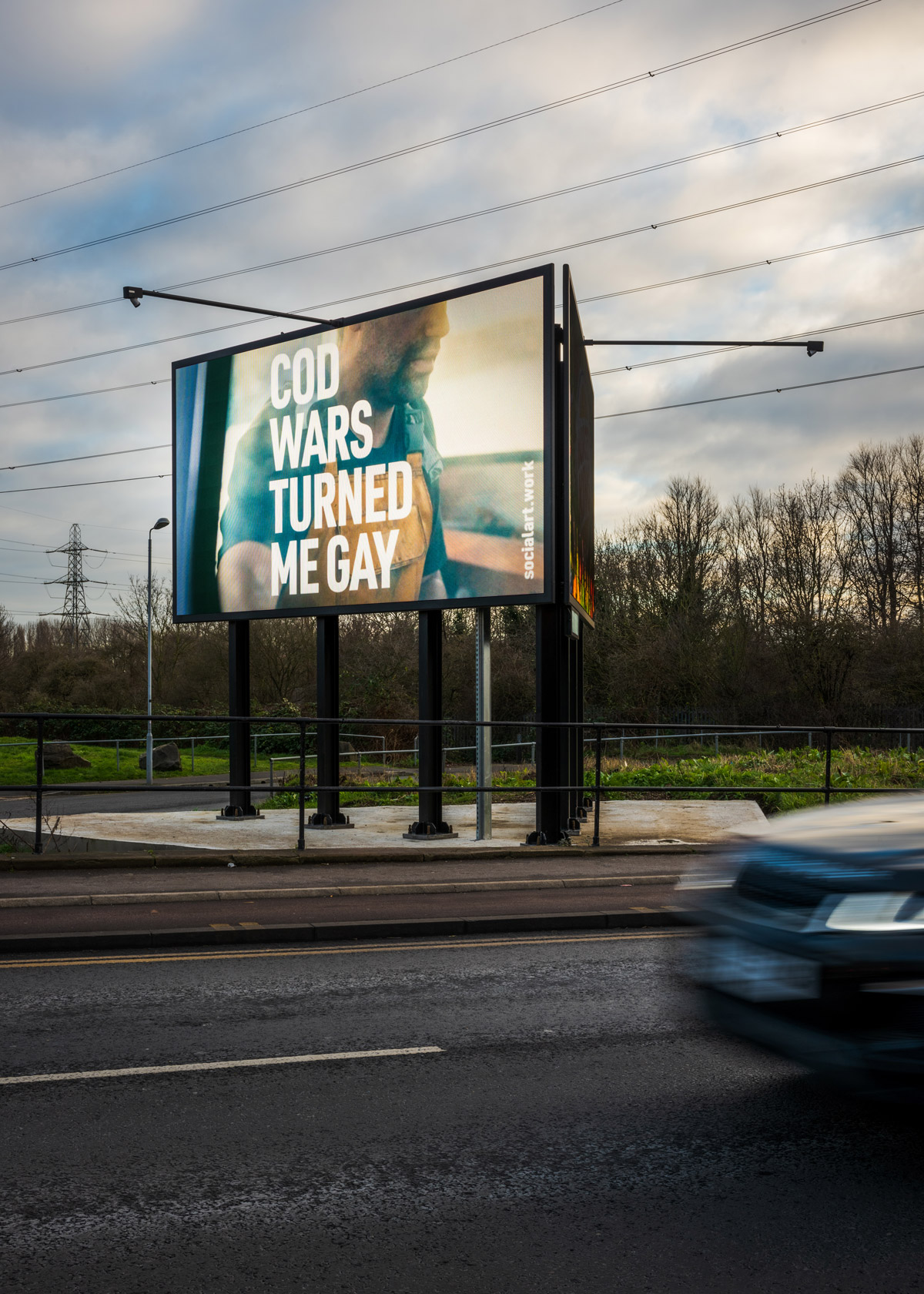 a series of 4 billboards heralding the 50th anniversary year of Gay Pride in the UK. Digital 48-sheet billboard, Lea Valley, London UK. Photographed by Yves Salmon, 24 January 2022. 'Cod Wars' broke out between Iceland and the UK in 1972 - the same year the UK's first Gay Pride march took place.