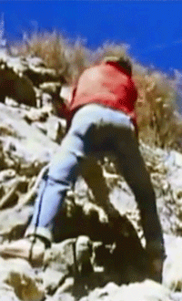 A 15 frame, colour gif focuses on the moving buttocks of a young man in a classic action-adventure scene. This found footage, reworked in this way, evokes the idea of the 'gay gaze' in which men are regarded as sexual objects. 7 June 2025, UK.