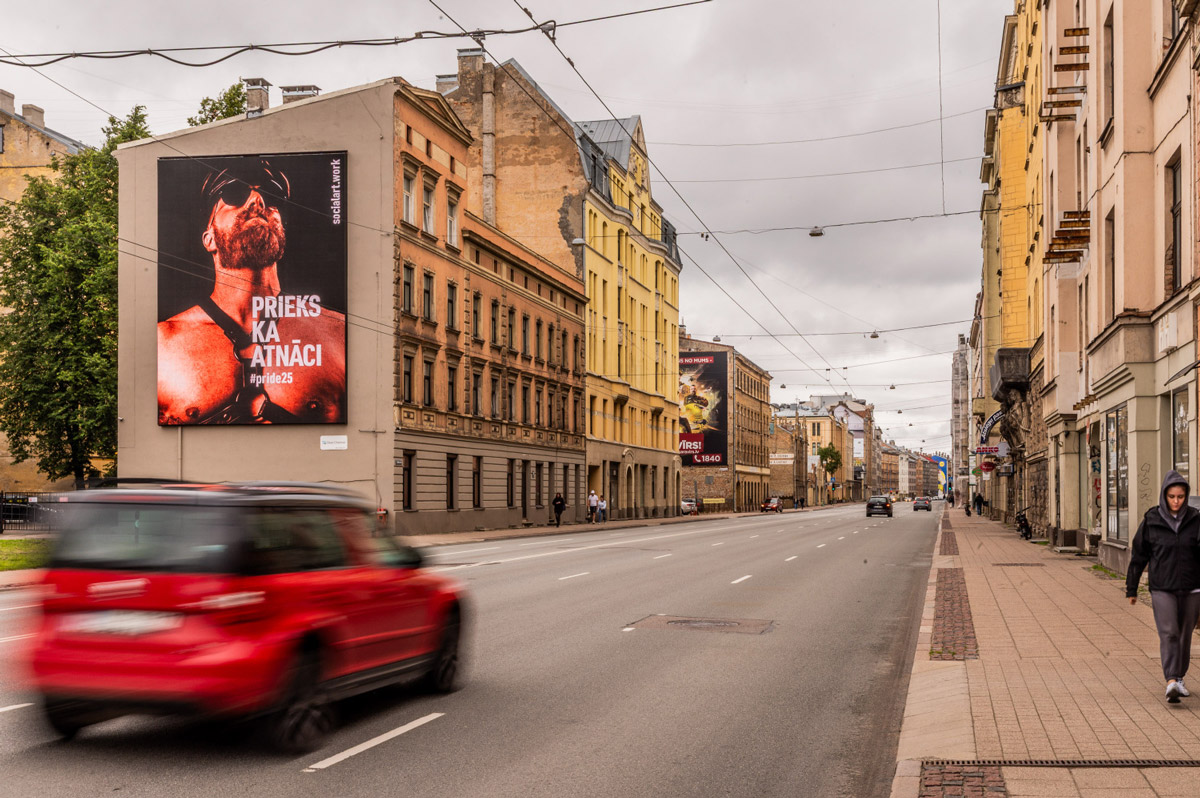 The work appears in Latvian, one of the two oldest European languages. This is required by law but is also the artist's preferred strategy because it roots the work in the local language.