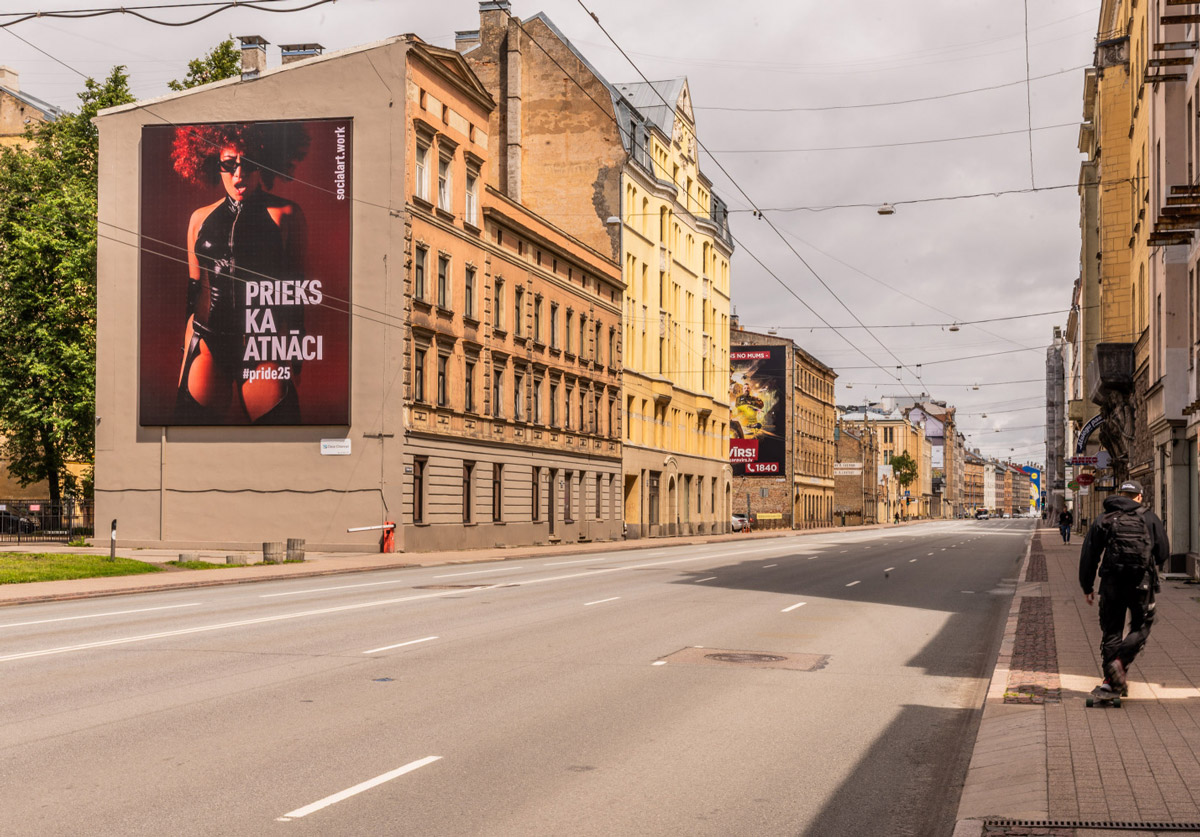 The work appears in Latvian, one of the two oldest European languages. This is required by law but is also the artist's preferred strategy because it roots the work in the local language.