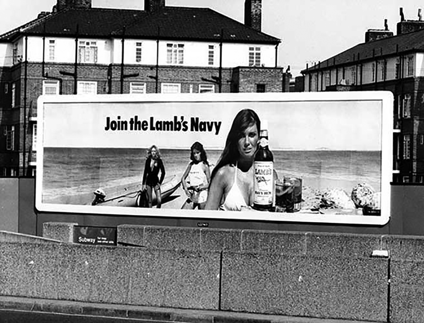 Lamb's Navy Rum billboard featuring Caroline Munro, c. 1980, UK. Exact location and photographer unknown.