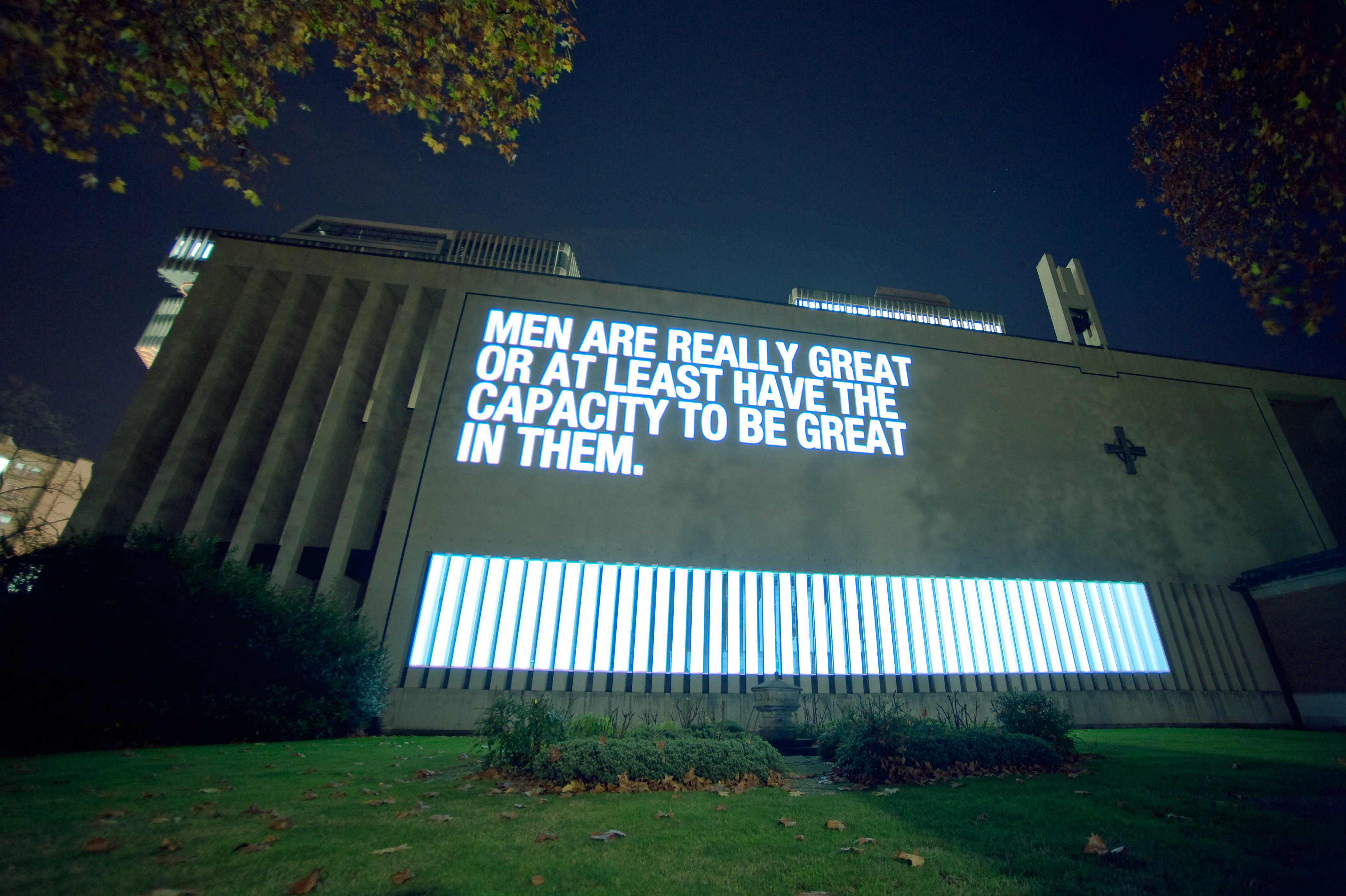 Text, graphics and video interviews were projected onto the 1960s modernist elevations of the Guards' Chapel with sound delivered by wireless headsets to the audience in the concourse by the West Front. The artist's aim was to provide a complete contemporary definition of heroism including heroes from science, the arts and the LGBT+ community more in keeping with a plural, modern Britain.