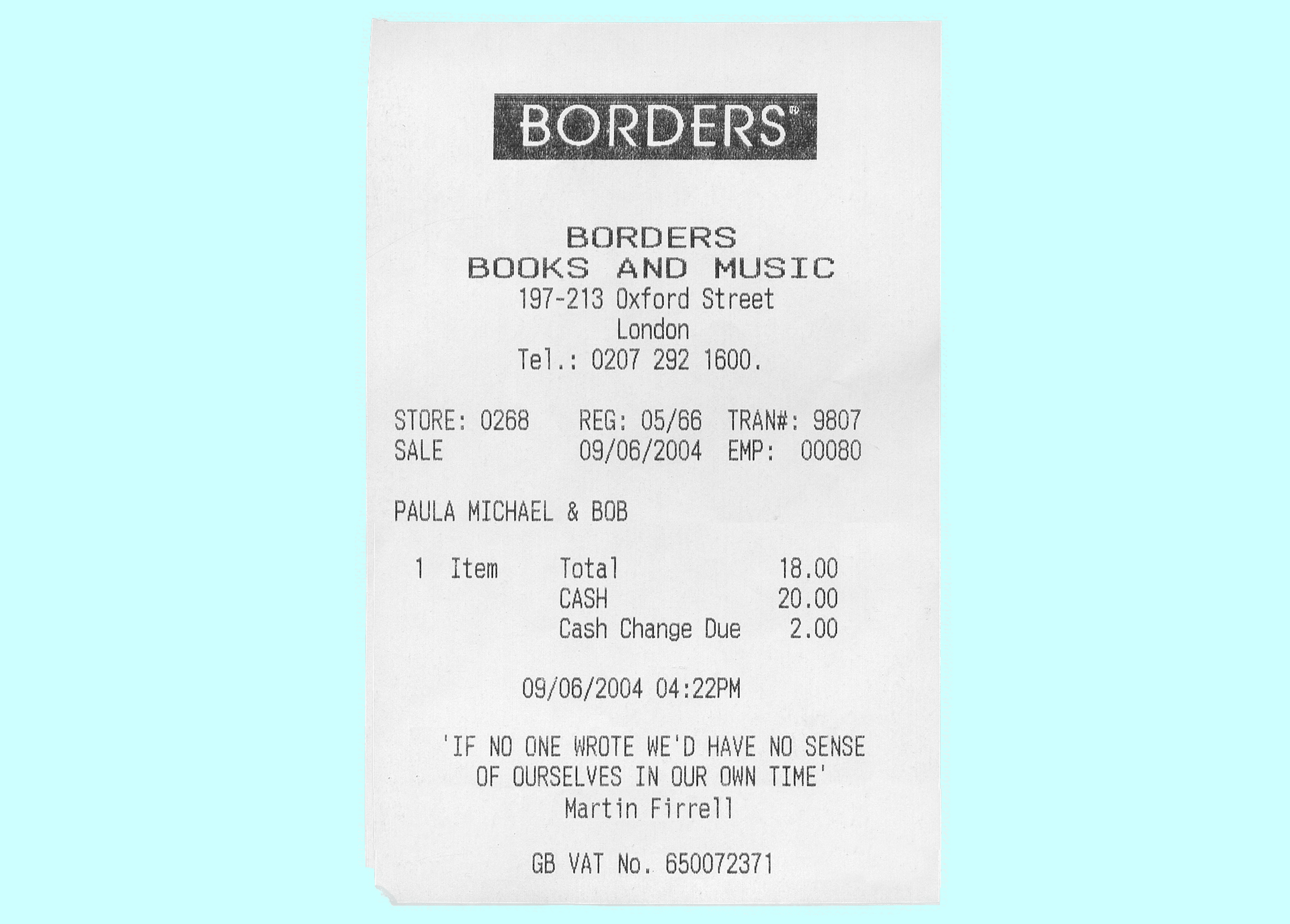 2004. Electronic tills at Borders Books are re-programmed to add an additional text to the bottom of each till receipt issued. In
